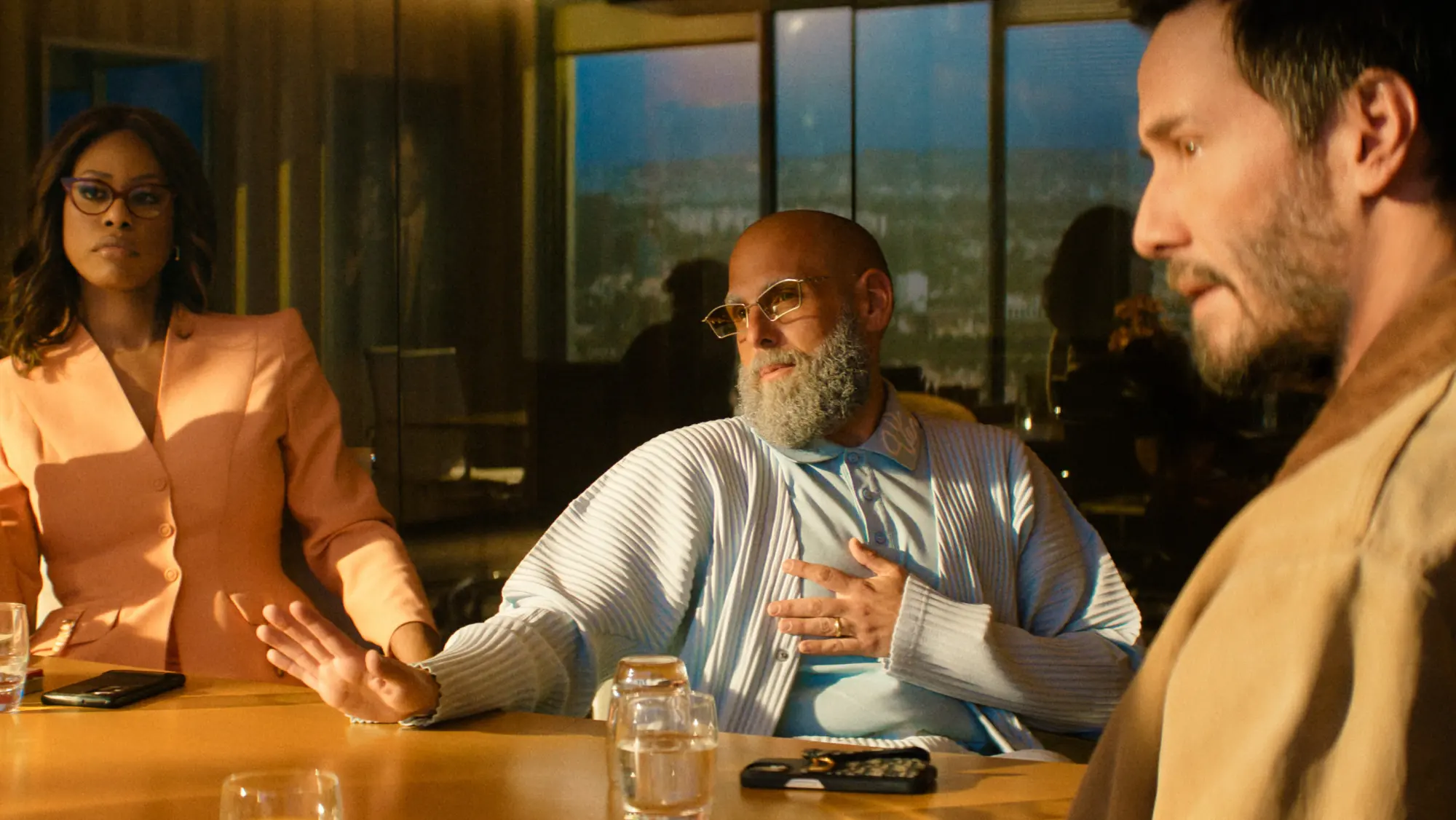 Y ese es el problema de fondo. La sátira necesita que la contradicción sea creíble. Si el público no puede imaginarse a este hombre haciendo algo verdaderamente reprehensible, toda la estructura del chantaje se desinfla. Reef se siente demasiado limpio para la historia que Hill quiere contar. Reeves en sobriedad es Reeves tranquilo, sereno, observador. Lo que la película nunca logra mostrarnos es quién era Reef cuando no lo era.